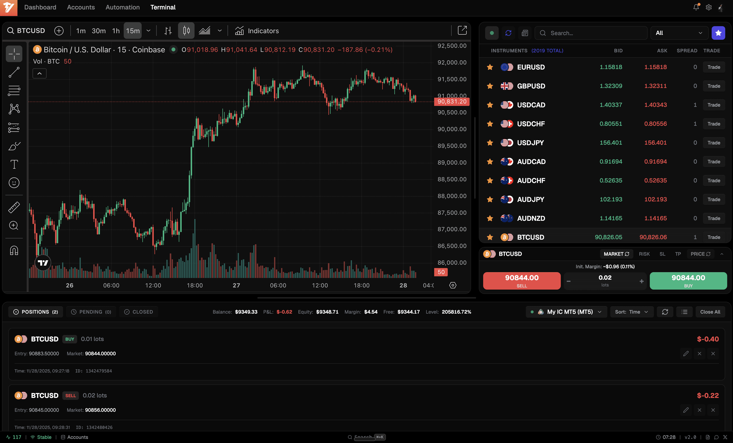 Trade, Automate, and Copy trades across MT4, MT5, and TradeLocker accounts.