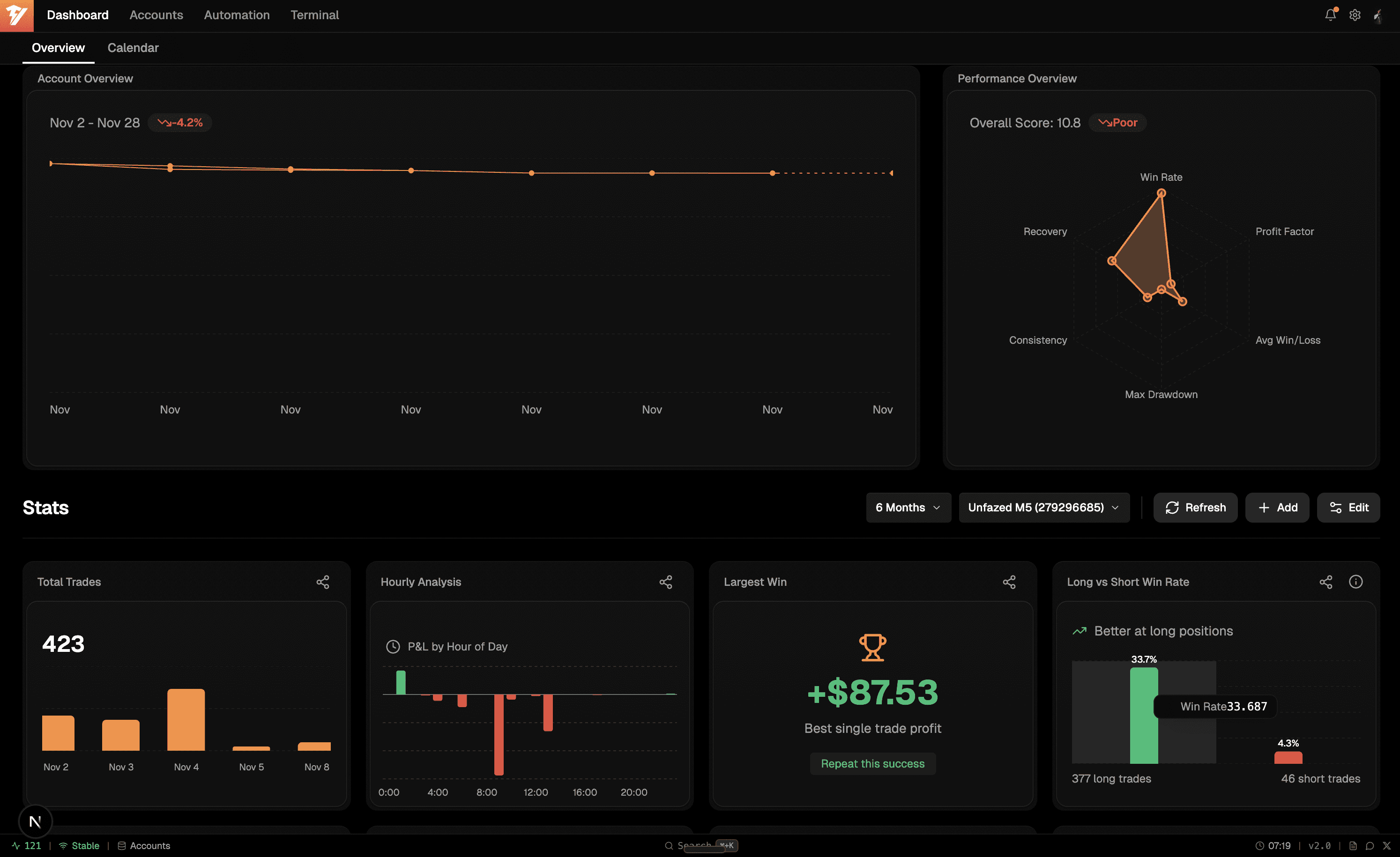 Stop juggling 5 different terminals. One dashboard shows everything: all accounts, all positions, total P&L, win rate, drawdown, and risk exposure. Trading made simple.