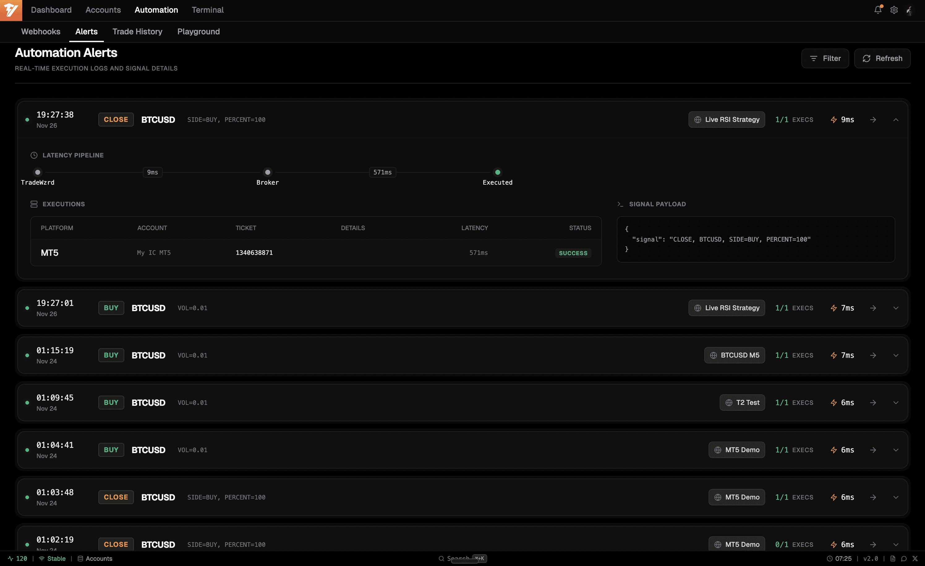 Execute trades in 0.7 seconds average from webhook to filled order.